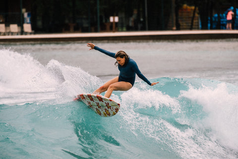 Personally, I wasted some money on the “Pro” session missing waves. The fact that it costs roughly between $18-$30 for each wave, whether you ride it or not, definitely makes it feel a little more high pressure than the ocean (but markedly cheaper than Kelly’s pool). The hardest thing to adjust to for me is not looking over your shoulder to gauge the wave. It appears essentially out of nowhere and the in-water guides instruct you to paddle towards different landmarks, like a light pole or a logo, which makes it harder to make subtle positioning adjustments you might make when paddling a farther distance. Once you’re up though, it’s easy to focus more on your surfing than what the wave is doing since the wave is mostly the same each time.